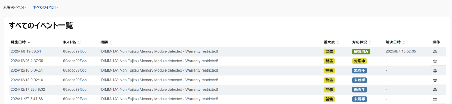 すべてのイベント一覧では、未解決イベント一覧で表示する情報に加え、以下の情報を参照できます。