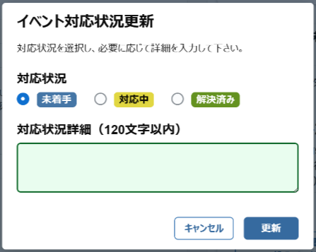 | 対応状況詳細 | イベントの対応状況を `対応中` に設定する際、対応状況のメモを任意に設定することができます。 | |