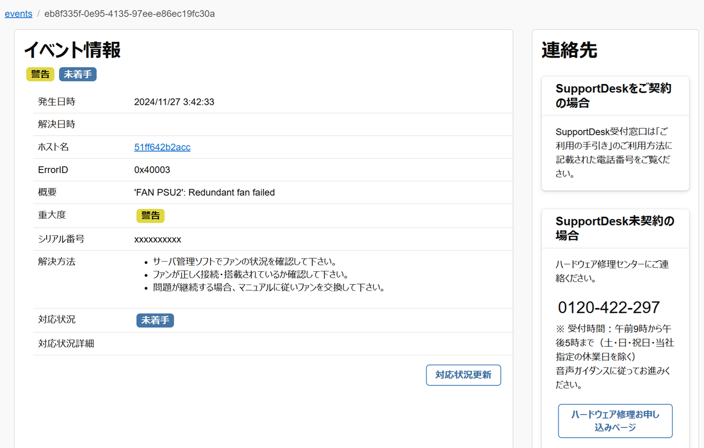 ハードウェアの故障など、ハードウェアサポートに連絡が必要な場合、連絡先欄に表示されている説明に従って対応依頼の連絡をお願いします。