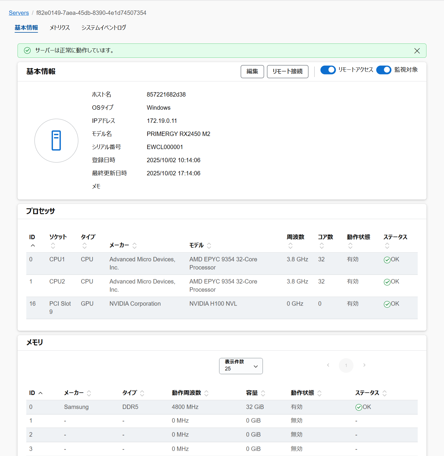 | 基本情報 | 装置の基本的な情報です。 サーバー一覧で表示するものに加え、モデル名・登録日時・最終更新日時を表示します。 |