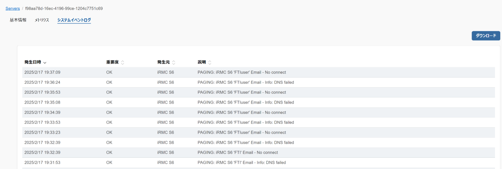 イベント情報をダウンロードするには、[ダウンロード]ボタンをクリックします。 そのサーバーに対する全期間のイベントログが一括で、CSV 形式でダウンロードされます。