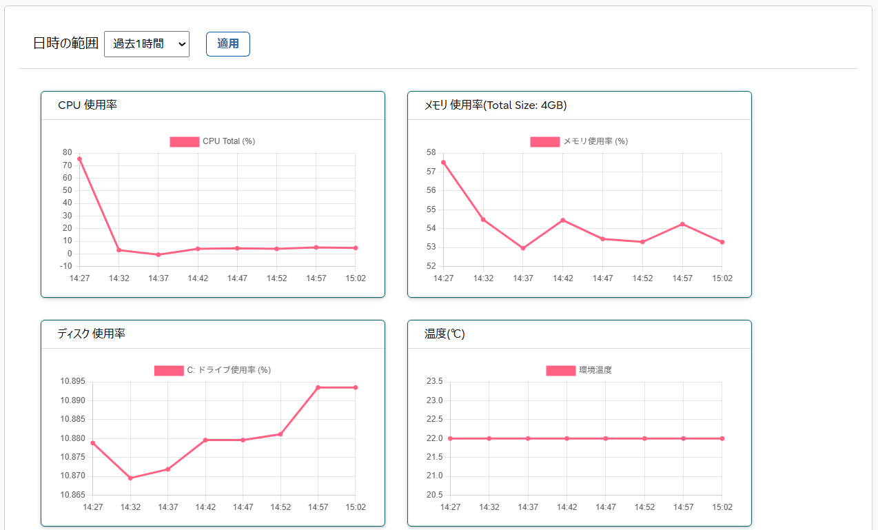 | ディスク使用率 | OSから取得した、その装置に搭載されているドライブ(C, D, ..)毎の領域の使用率(%)を表示します。ドライブが複数搭載されていれば複数のグラフを表示します。ただし、ドライブレターが設定されていないドライブは表示されません。 | |